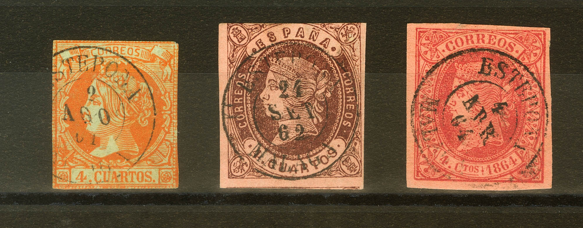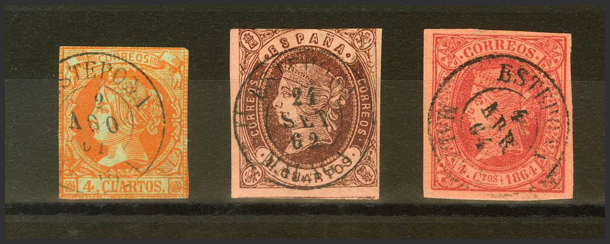 52, 58, 64. (1860ca). Conjunto de tres sellos del 4 cuartos amarillo, castaño y rosa, inutilizados con el matasello ESTEPONA / MALAGA. BONITOS.