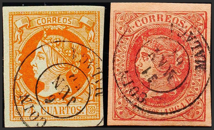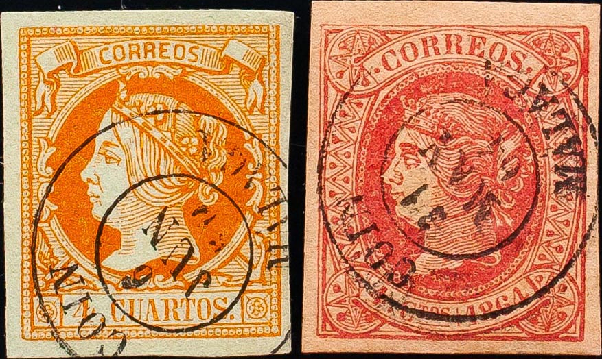 52, 64. (1860ca). Conjunto de dos sellos del 4 cuartos amarillo y 4 cuartos rosa, inutilizados con matasello COIN / MALAGA. MAGNIFICO.