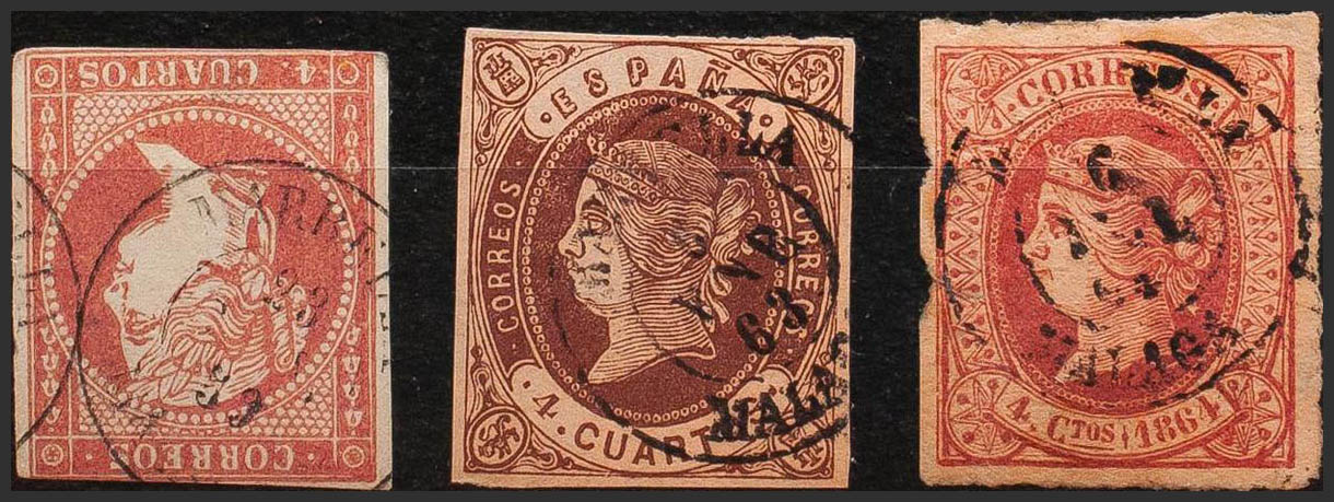48, 58, 64. (1855ca). Conjunto de tres sellos del 4 cuartos rojo, castaño y rosa, inutilizados con el matasello MARBELLA / MALAGA. BONITOS.