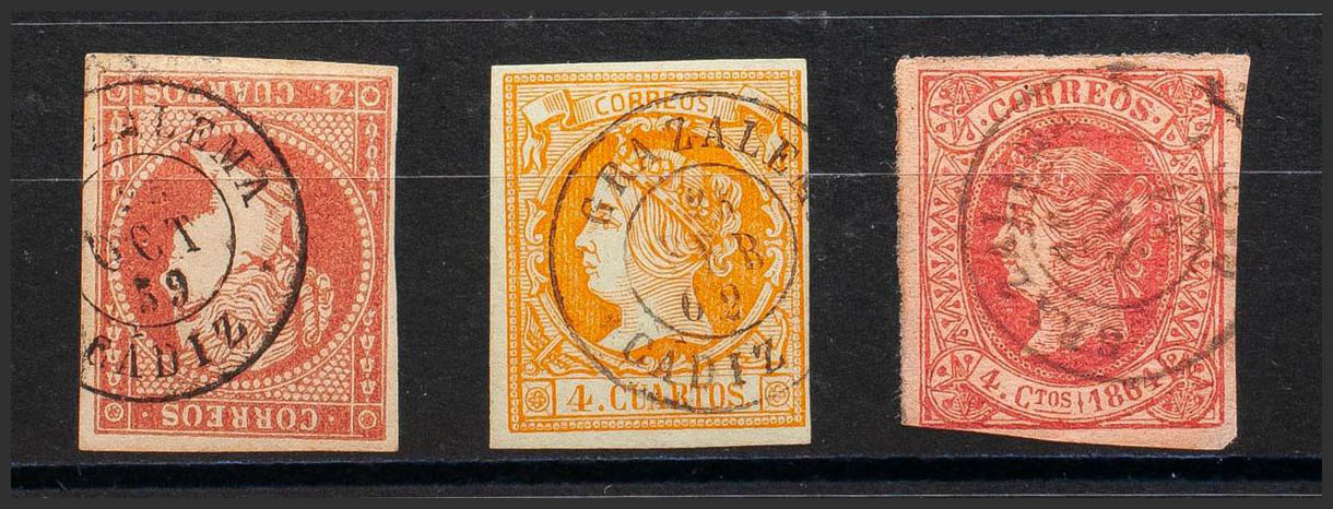 48, 52, 64. (1855ca). Conjunto de tres sellos del 4 cuartos rojo, amarillo y rosa, inutilizados con matasello GRAZALEMA / CADIZ. MAGNIFICO.