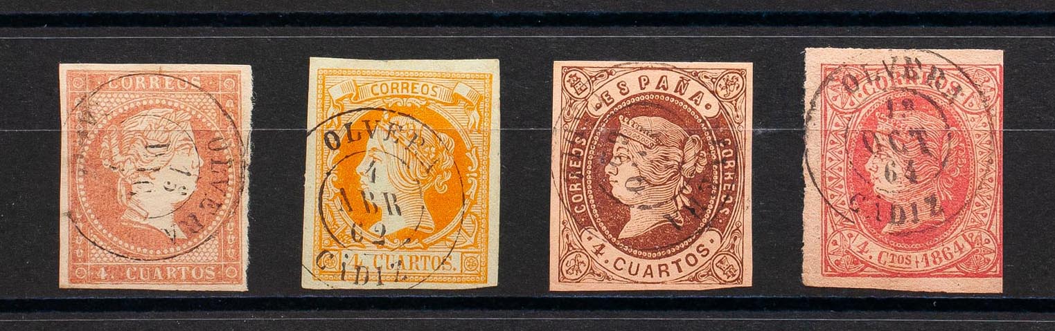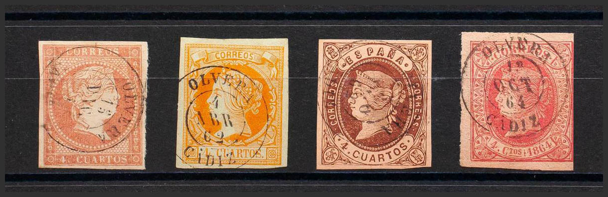 48, 52, 58, 64. (1855ca). Conjunto de cuatro sellos del 4 cuartos rojo, amarillo, castaño y rosa, inutilizados con matasello OLVERA / CADIZ. MAGNIFICO.