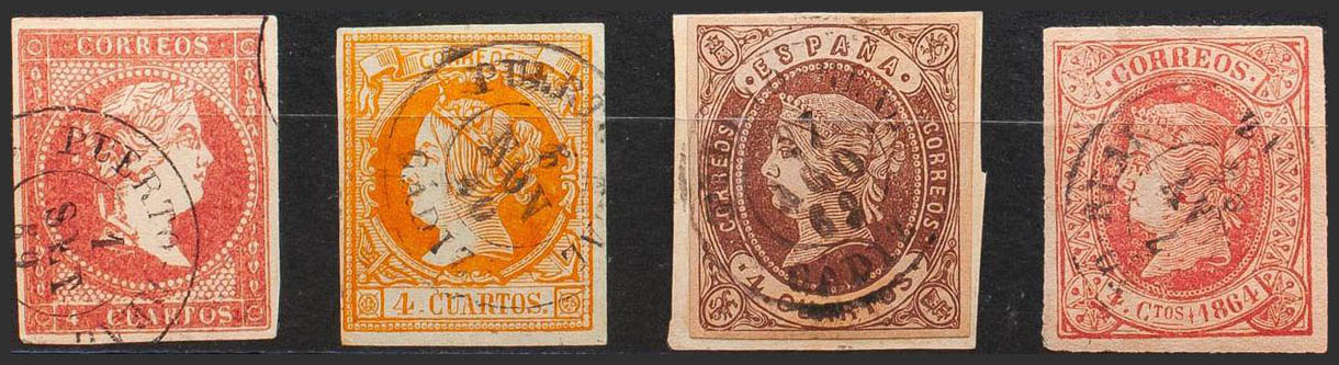 48, 52, 58, 64. (1855ca). Conjunto de cuatro sellos del 4 cuartos rojo, amarillo, castaño y rosa, inutilizados con matasello PUERTO-REAL / CADIZ. MAGNIFICO.