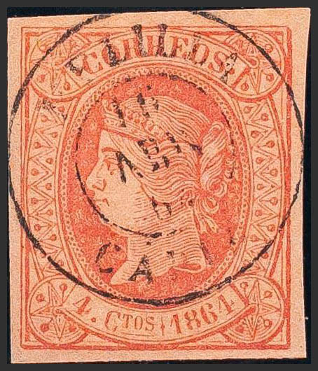 64. 1864. 4 cuartos rosa. Matasello MELILLA / CADIZ. MAGNIFICO Y MUY RARO.