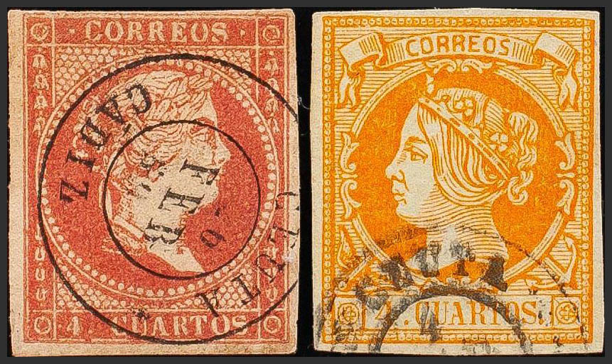 48, 52. 1855. Conjunto de dos sellos del 4 cuartos rojo y 4 cuartos amarillo, inutilizados con el matasello CEUTA / CADIZ. MAGNIFICO.