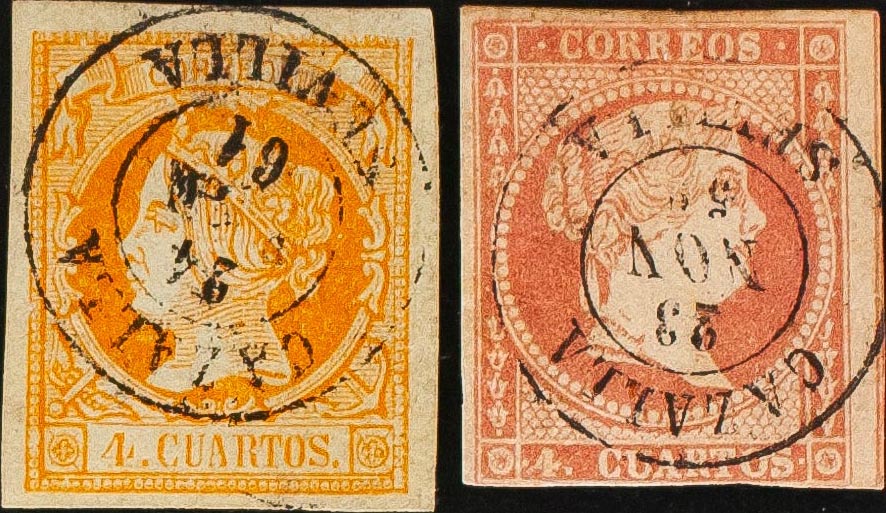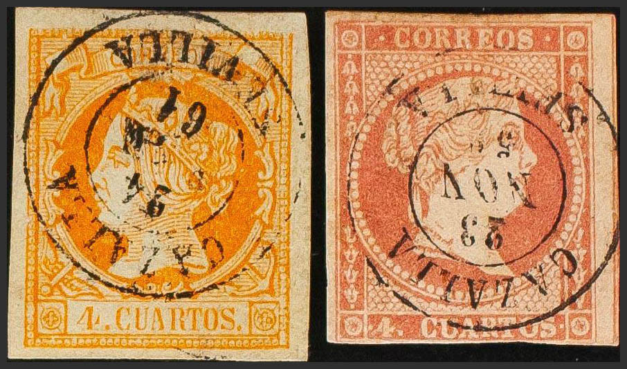 48, 52. 1855. Conjunto de dos sellos del 4 cuartos rojo y 4 cuartos amarillo, inutilizados con el matasello CAZALLA / SEVILLA. MAGNIFICO.