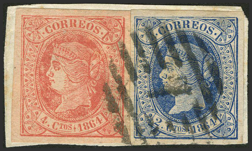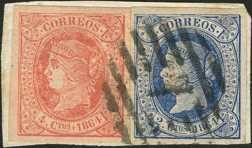 △ 63, 64. 1864. 4 cuartos y 2 cuartos, sobre fragmento. Matasello PARRILLA Nº7. MAGNIFICO.