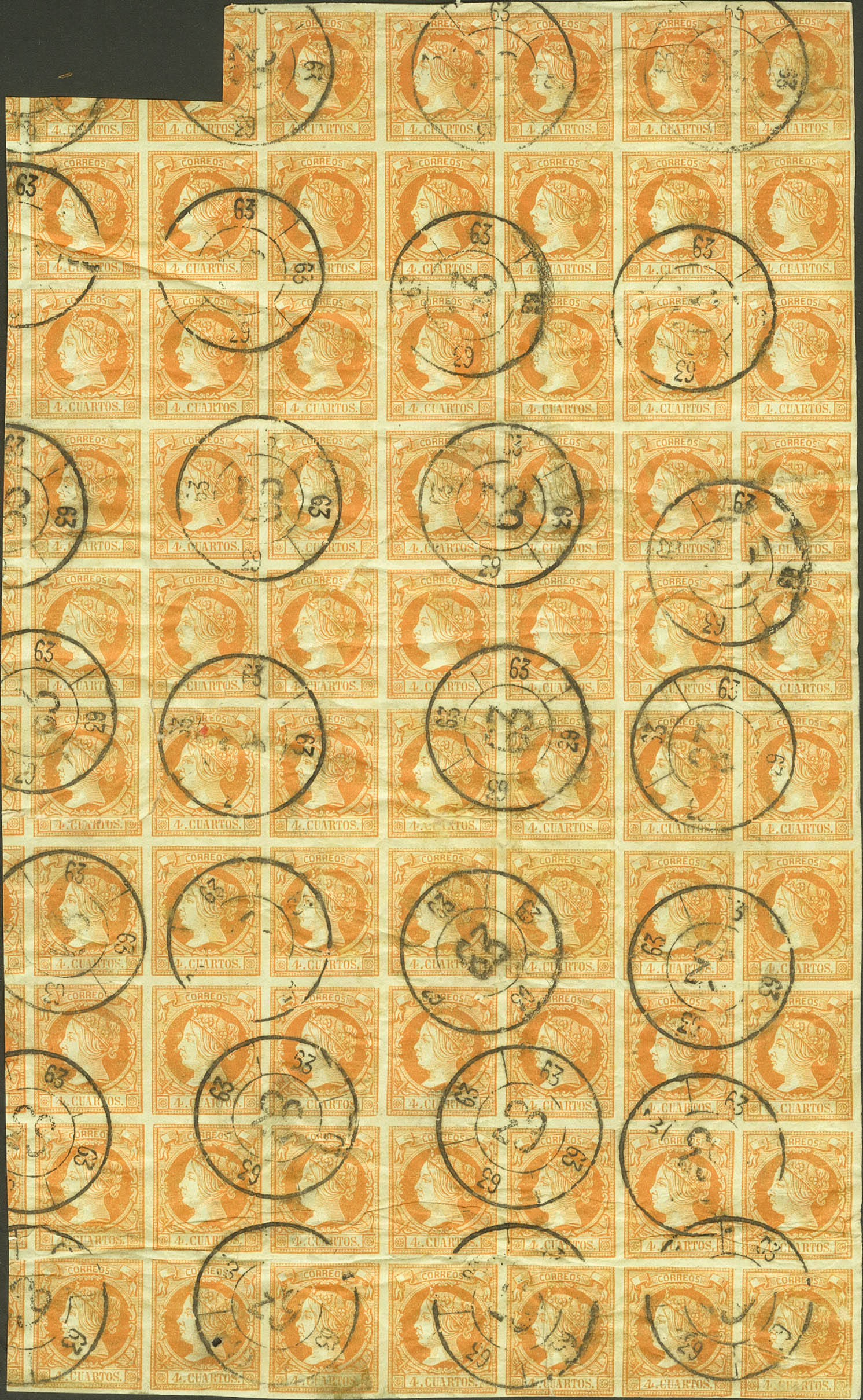 52(68). 1860. 4 cuartos naranja, bloque de sesenta y ocho. Matasello R.CARRETA Nº63, de San Roque. MAGNIFICO Y PIEZA DE ENORME ESPECTACULARIDAD.