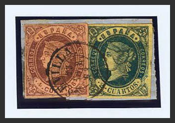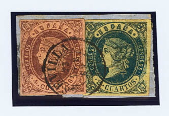 57, 58. 1862. 2 cuartos azul y 4 cuartos castaño, sobre fragmento. Matasello SEVILLA / (7). MAGNIFICO Y RARO.