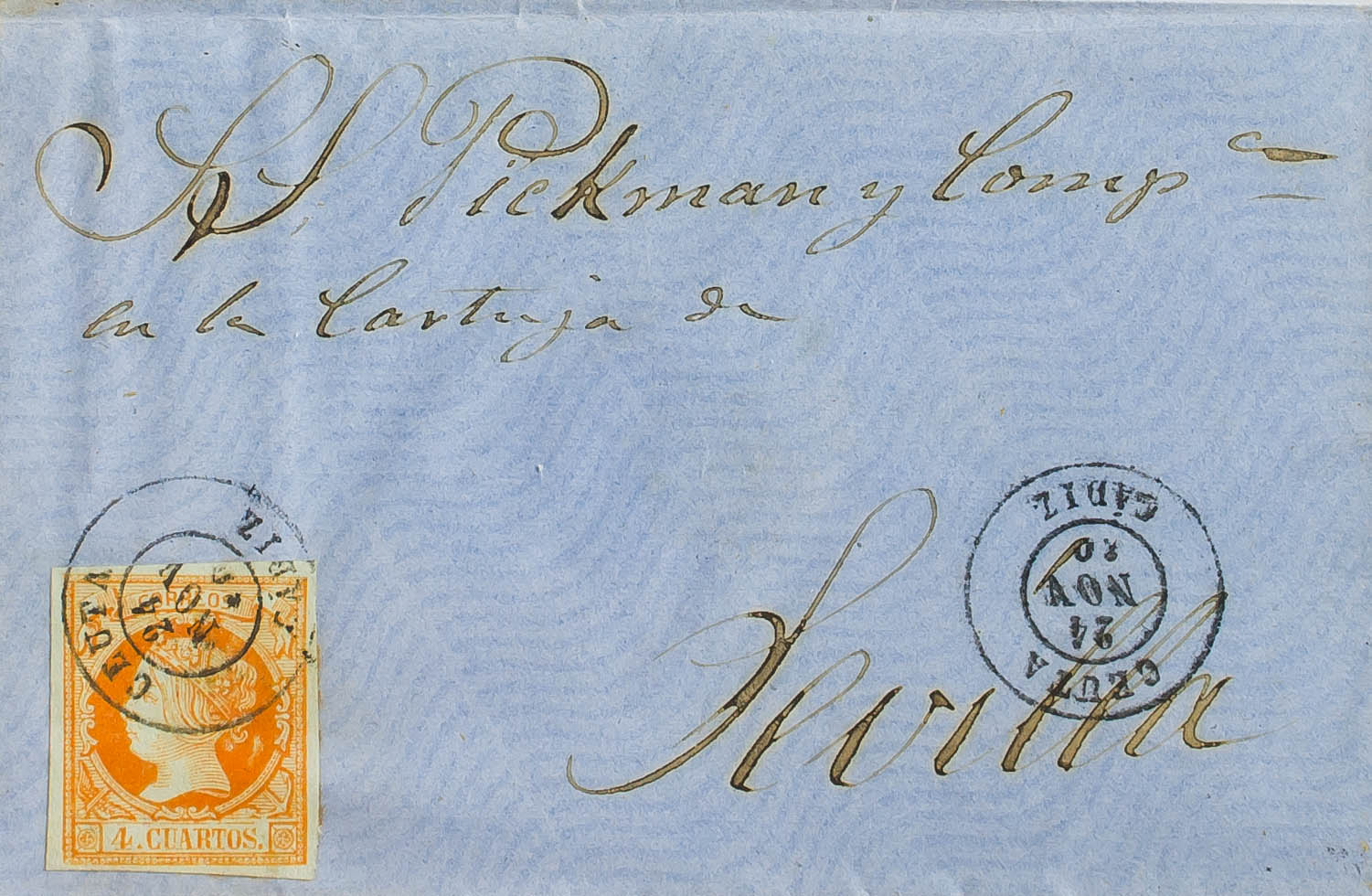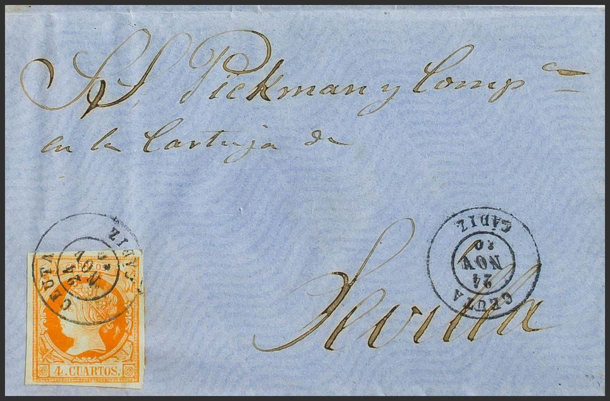 52. 1860. 4 cuartos amarillo. CEUTA a SEVILLA. Matasello CEUTA / CADIZ. MAGNIFICO Y RARISIMO.
