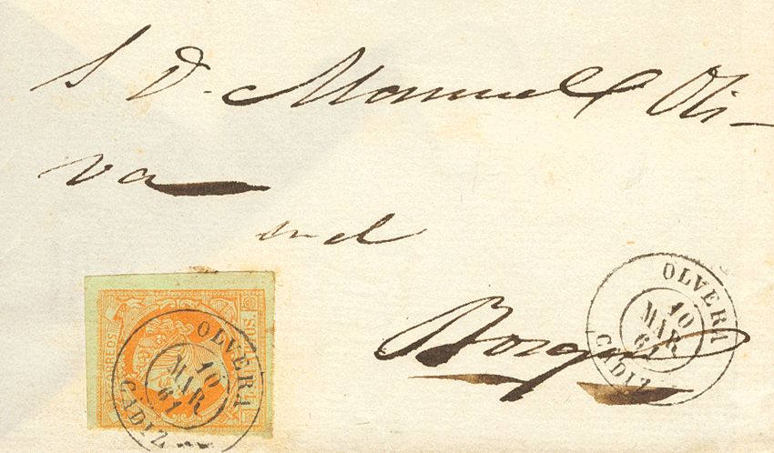52. 1860. 4 cuartos amarillo, esquina de hoja. OLVERA a MOGUER. Matasello OLVERA / CADIZ. MAGNIFICA.