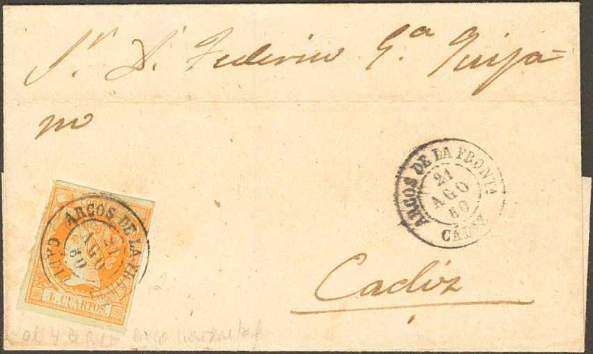52. 1860. 4 cuartos amarillo. ARCOS DE LA FRONTERA a CADIZ. Matasello ARCOS DE LA FRONTª / CADIZ. MAGNIFICA.