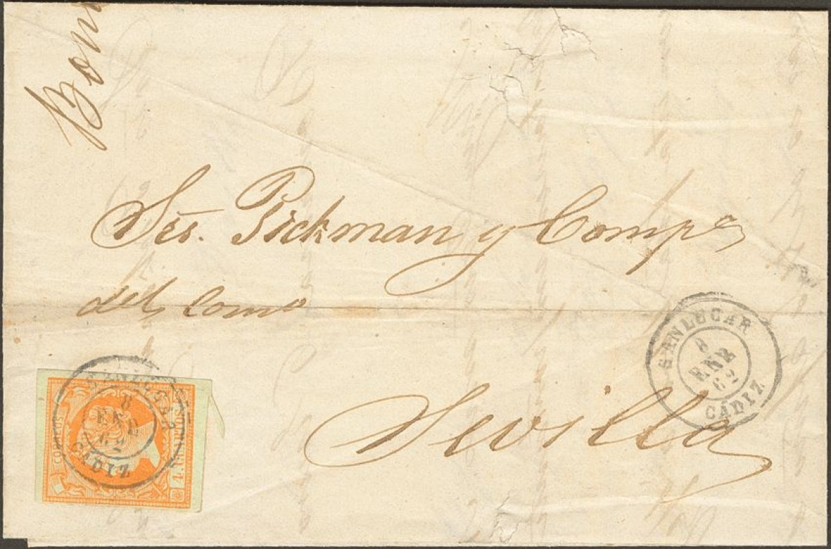52. 1860. 4 cuartos amarillo. SANLUCAR a SEVILLA. Matasello SANLUCAR / CADIZ. MAGNIFICA.