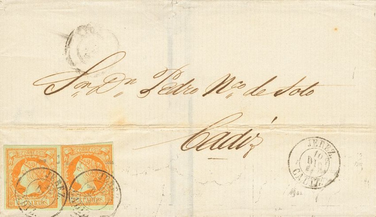 52(2). 1860. 4 cuartos amarillo, pareja. JEREZ a CADIZ. Matasello JEREZ / CADIZ. MAGNIFICA.