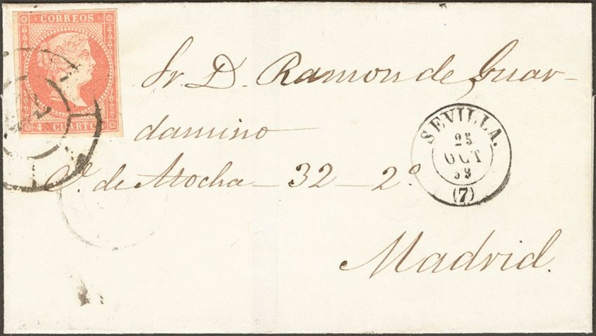48B. 1856. 4 cuartos rojo. SEVILLA a MADRID. Matasello R. CARRETA Nº 1.
