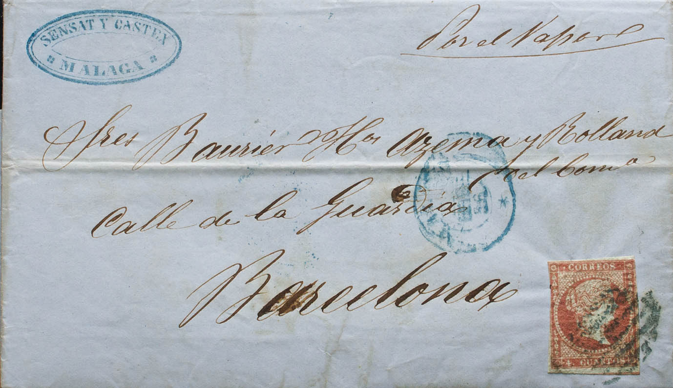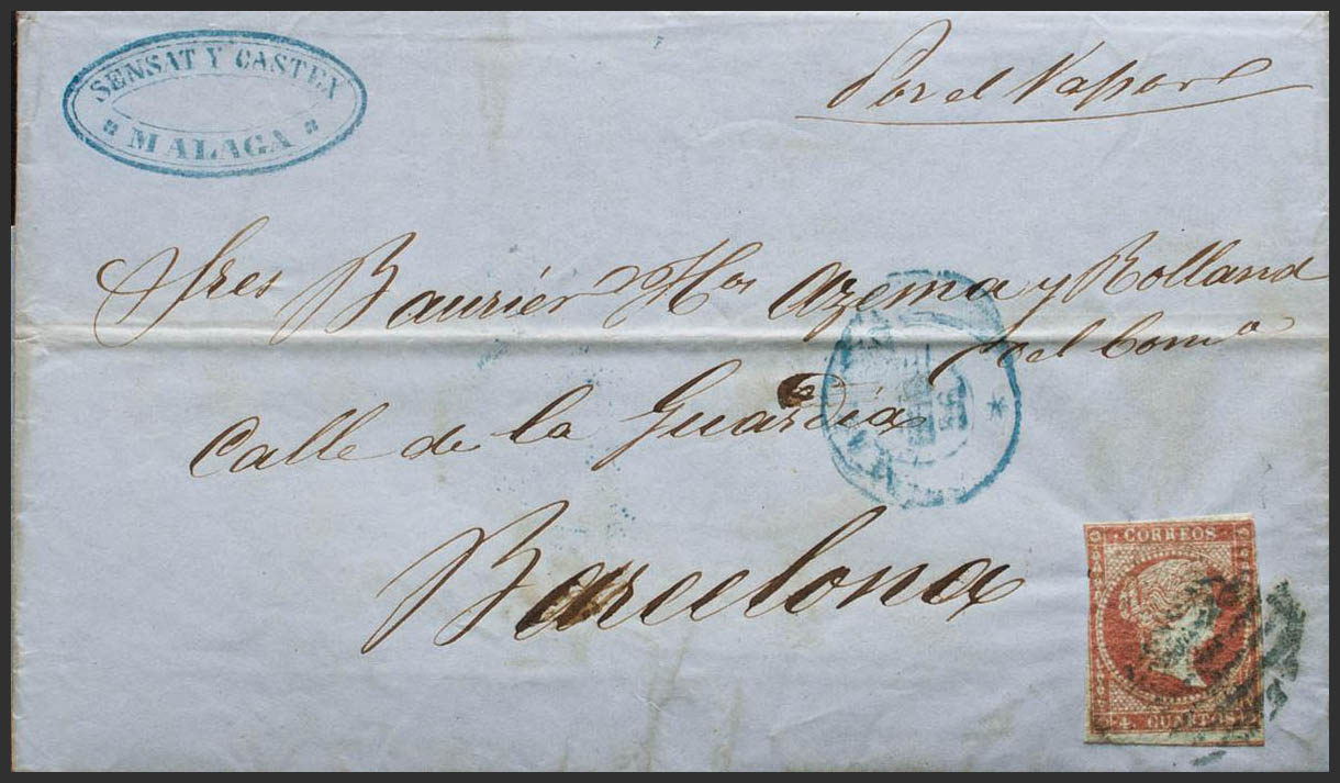 40. 1856. 4 cuartos rojo. MALAGA a BARCELONA. Matasello PARRILLA, en azul y en el frente manuscrito "Por el Vapor". MAGNIFICA.