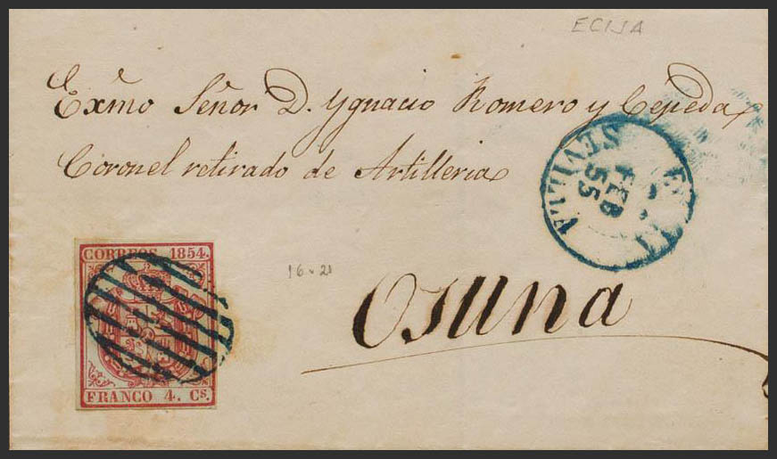 33A. 1855. 4 cuartos carmÃn PAPEL AZULADO. ECIJA a OSUNA. Matasello PARRILLA, en azul. MAGNIFICA.