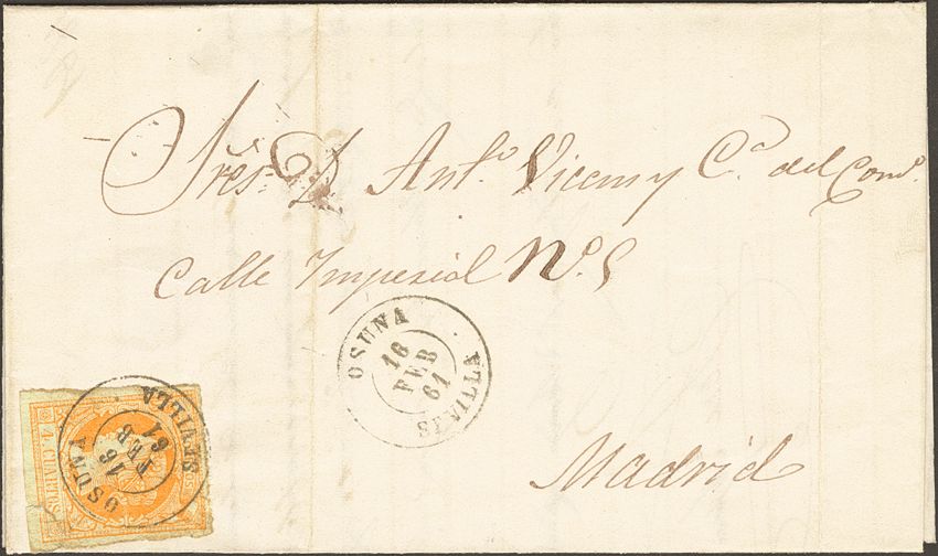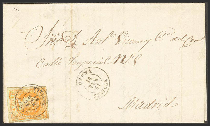 52. 1860. 4 cuartos amarillo (sello deteriorado en su época). OSUNA a SEVILLA. Matasello OSUNA / SEVILLA. BONITA.