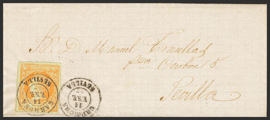 52. 1860. 4 cuartos amarillo. CARMONA a MADRID. Matasello CARMONA / SEVILLA. MAGNIFICA.