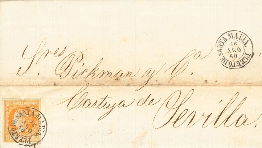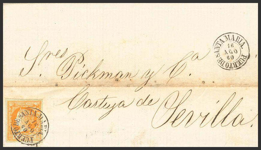 52. 1860. 4 cuartos amarillo. PUERTO DE SANTA MARIA a SEVILLA. Matasello PUERTO DE SANTA MARIA / CADIZ. MAGNIFICA.