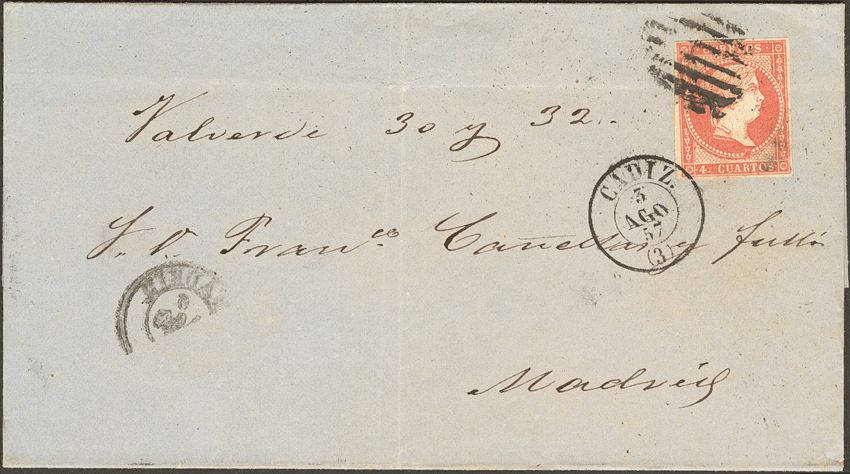 48. 1857. 4 cuartos rojo. CADIZ a MADRID. Matasello PARRILLA, al lado CADIZ / (3).