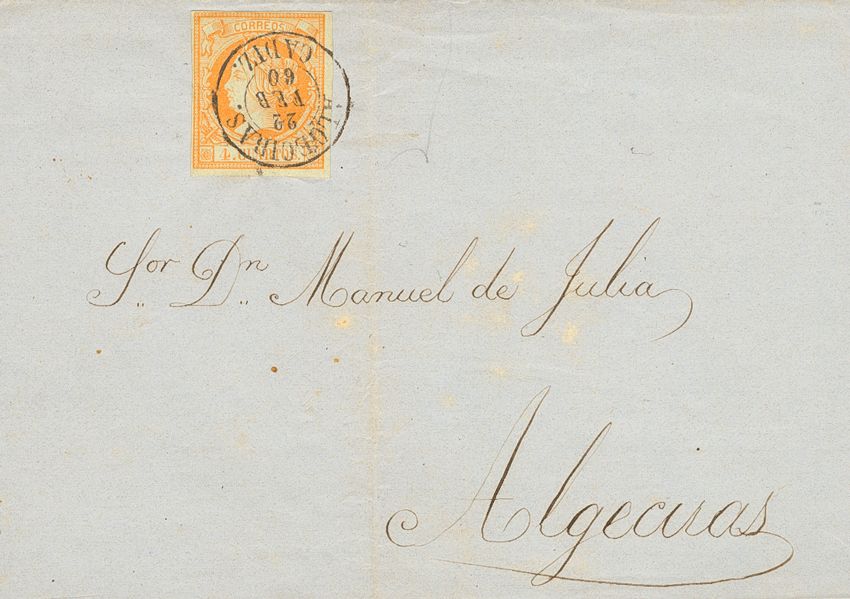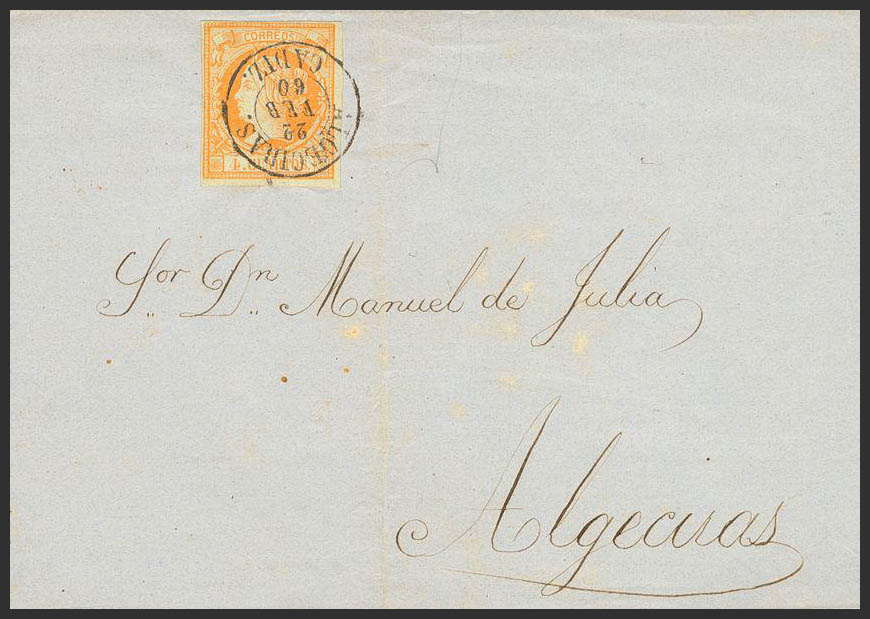 52. 1860. 4 cuartos amarillo. Dirigida a ALGECIRAS. Matasello ALGECIRAS / CADIZ. MAGNIFICA.