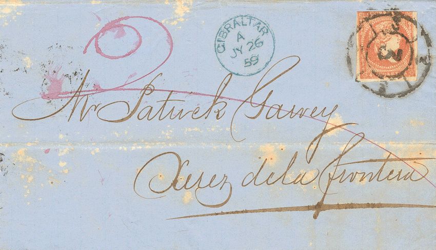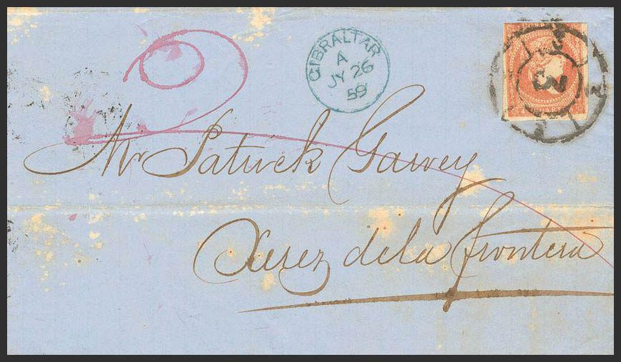 48. 1858. 4 cuartos rojo. GIBRALTAR a JEREZ. Matasello R. CARRETA Nº 3. Fechador del correo ingles GIBRALTAR, en azul y tasa manuscrita "2" peniques aplicada a los PACKET LETTERS. MUY RARO FRANQUEO MIXTO ESPAÑA-GRAN BRETAÑA. MAGNIFICA.