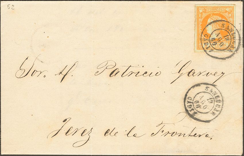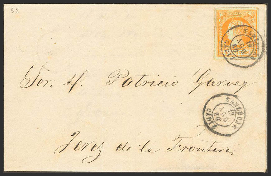 52. 1860. 4 cuartos amarillo. SANLUCAR a JEREZ. Matasello SANLUCAR / CADIZ. MAGNIFICA.