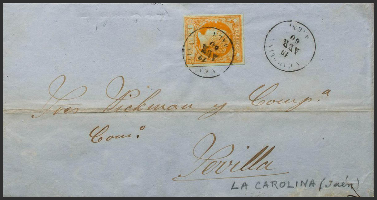 52. 1860. 4 cuartos naranja. LA CAROLINA a SEVILLA. Matasello LA CAROLINA / JAEN. MAGNIFICA.