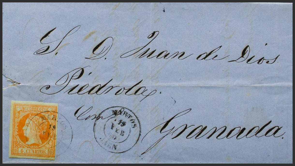 52. 1860. 4 cuartos naranja. MARTOS a GRANADA. Matasello MARTOS / JAEN. MAGNIFICA.
