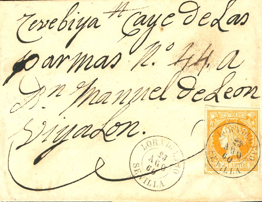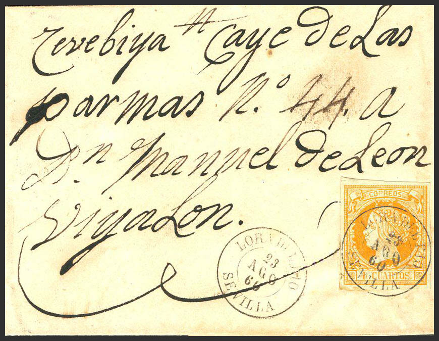 52. 1860. 4 cuartos amarillo. LORA DEL RIO a SEVILLA. Matasello LORA DEL RIO / SEVILLA. MAGNIFICA.