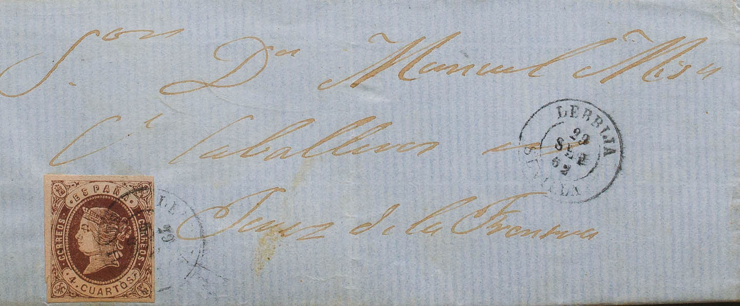 58. 1862. 4 cuartos castaño. LEBRIJA a JEREZ DE LA FRONTERA. Matasello LEBRIJA / SEVILLA. MAGNIFICA.