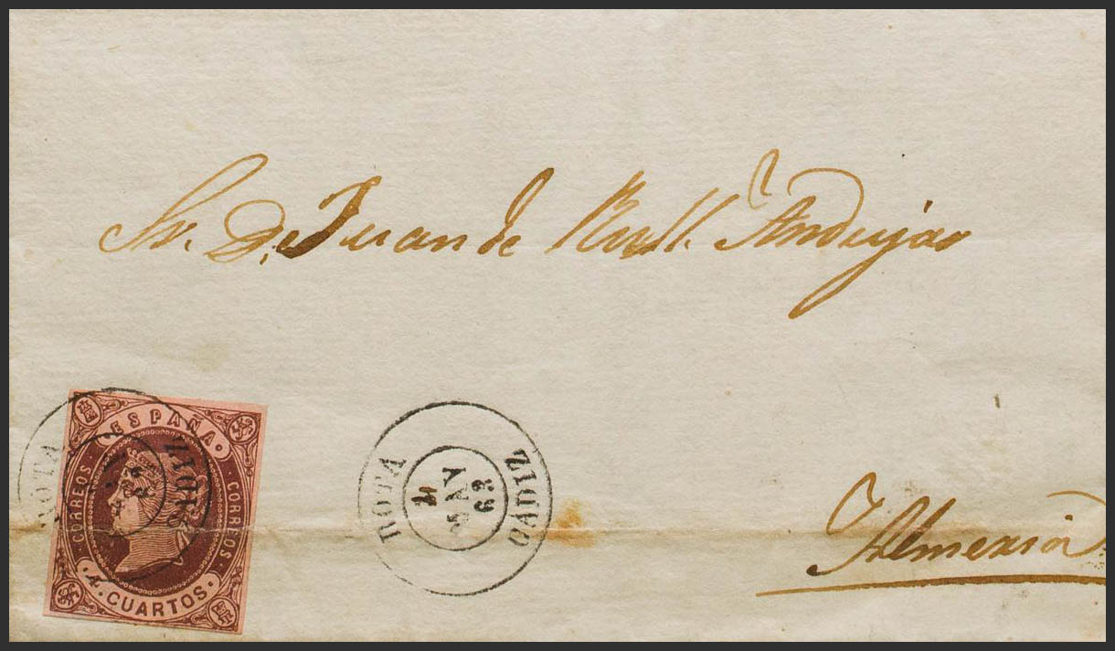 58. 1863. 4 cuartos castaño (pliegue de archivo). ROTA a ALMERIA. Matasello ROTA / CADIZ. BONITA Y MUY RARA.