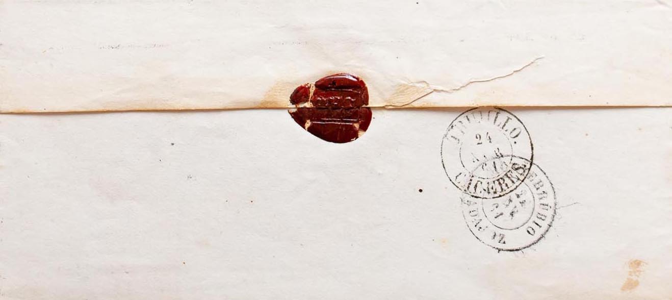 52. 1861. 4 cuartos naranja. FUENTE OVEJUNA a TRUJILLO. Matasello FUENTE OVEJUNA / CORDOBA. MAGNIFICA.