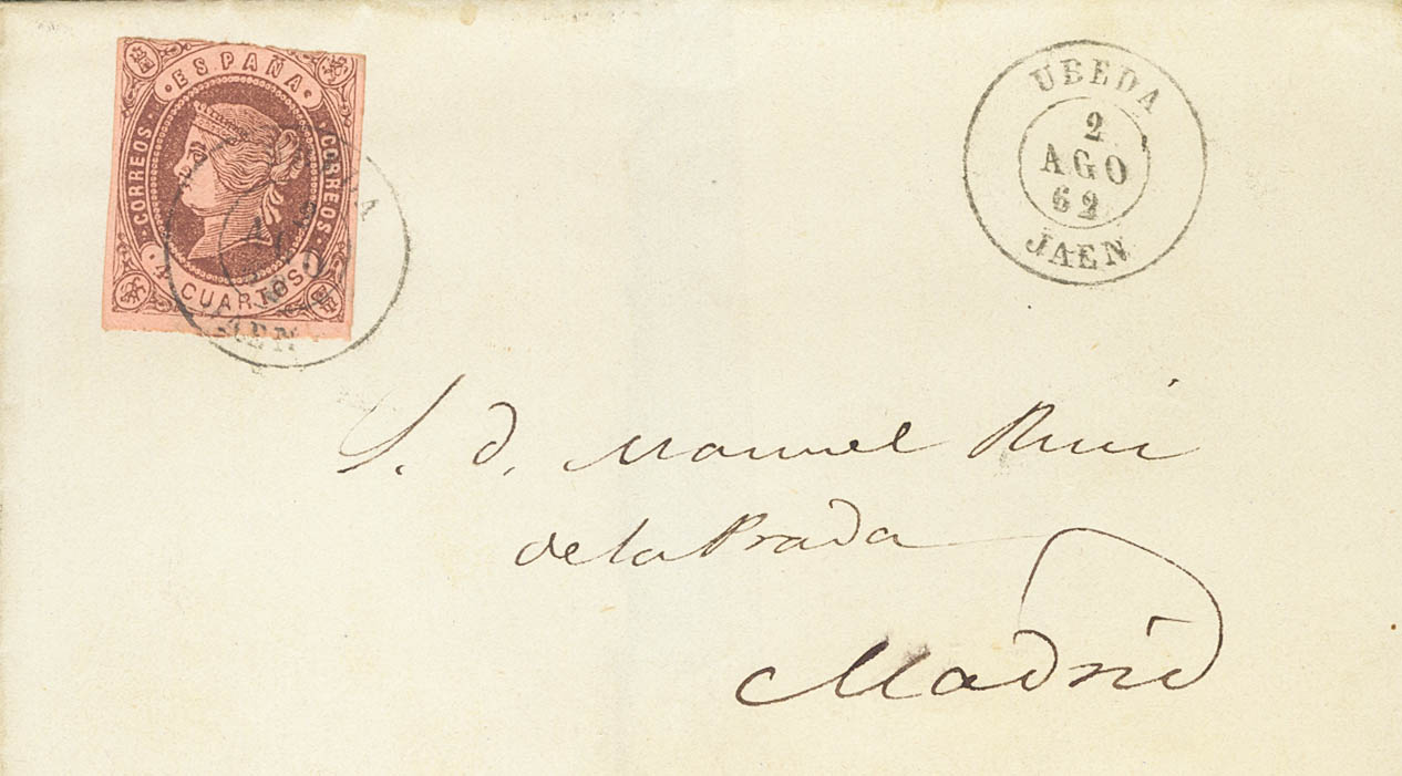 58. 1862. 4 cuartos castaño. UBEDA a MADRID. Matasello UBEDA / JAEN. MAGNIFICA.