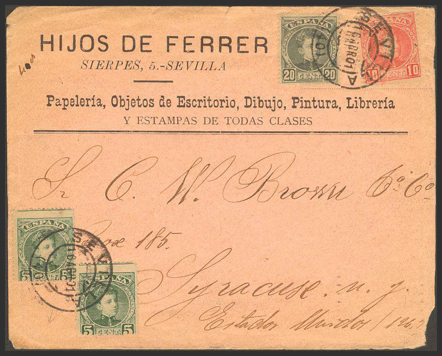 242(2), 243, 247. 1901. 5 cts, dos sellos, 10 cts y 20 cts. SEVILLA a SIRACUSA (USA). Matasello SEVILLA / (40). MAGNIFICA Y RARA COMBINACION CON EL 20 CTS.