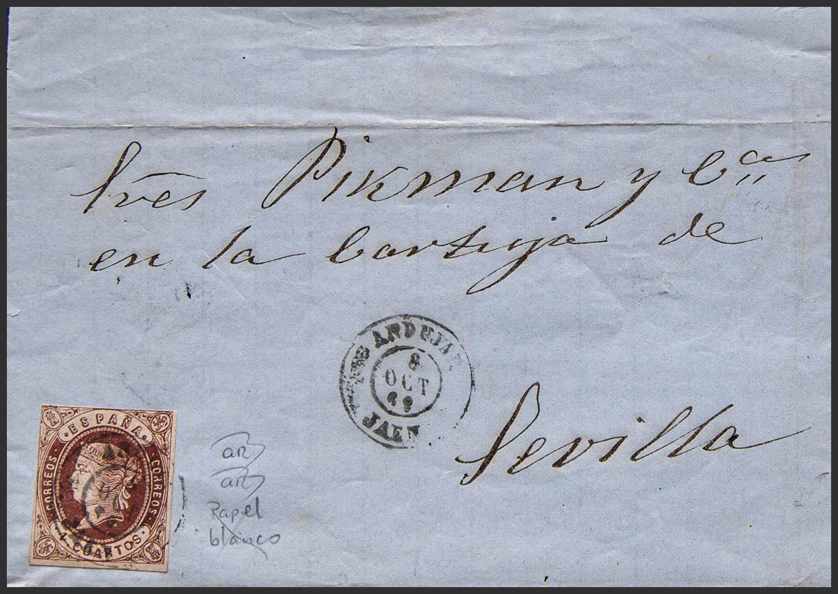 58. 1862. 4 cuartos castaño. ANDUJAR a SEVILLA. Matasello ANDUJAR / JAEN. MAGNIFICA.