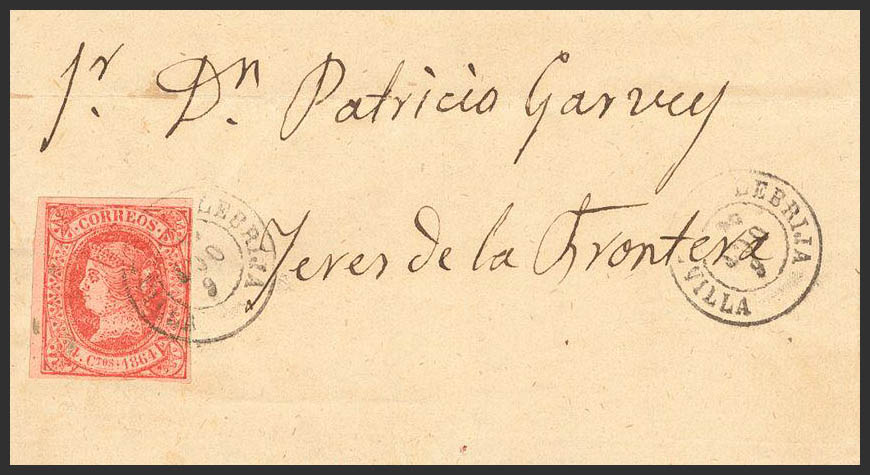 64. 1864. 4 cuartos rosa. LEBRIJA a JEREZ. Matasello LEBRIJA / SEVILLA. MAGNIFICA.