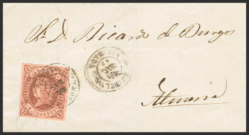 58. 1862. 4 cuartos castaño. MOTRIL a ALMERIA. Matasello MOTRIL / GRANADA. BONITA.