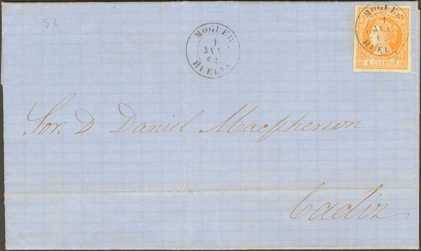 52. 1862. 4 cuartos naranja. MOGUER a CADIZ. Matasello MOGUER / HUELVA. MAGNIFICA.