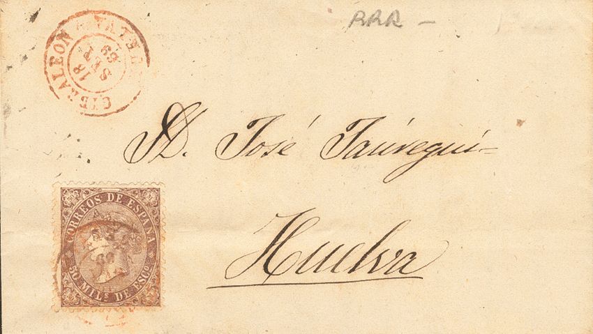 98. 1869. 50 mil. violeta. GIBRALEON a HUELVA. Matasello GIBRALEON / HUELVA, en rojo. MAGNIFICO Y RARISIMO.
