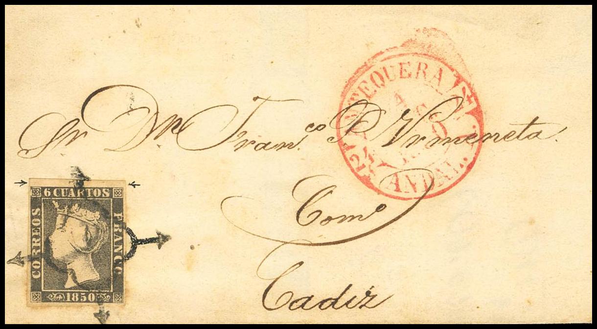 1. 1850. 6 cuartos negro, borde de hoja. ANTEQUERA a CADIZ. MAGNIFICA.