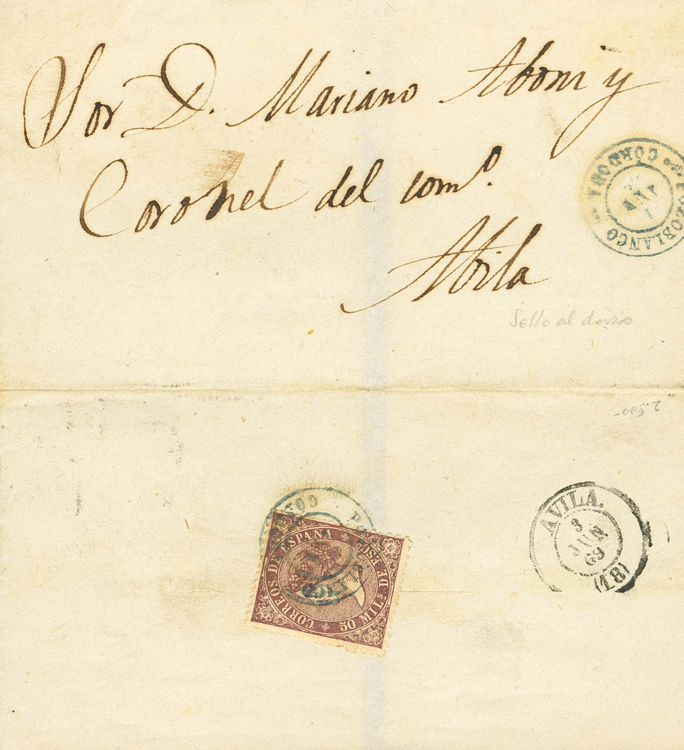 AndalucÃa. Historia Postal. Franqueada al dorso POZOBLANCO / CORDOBA, en azul. MAGNIFICA.