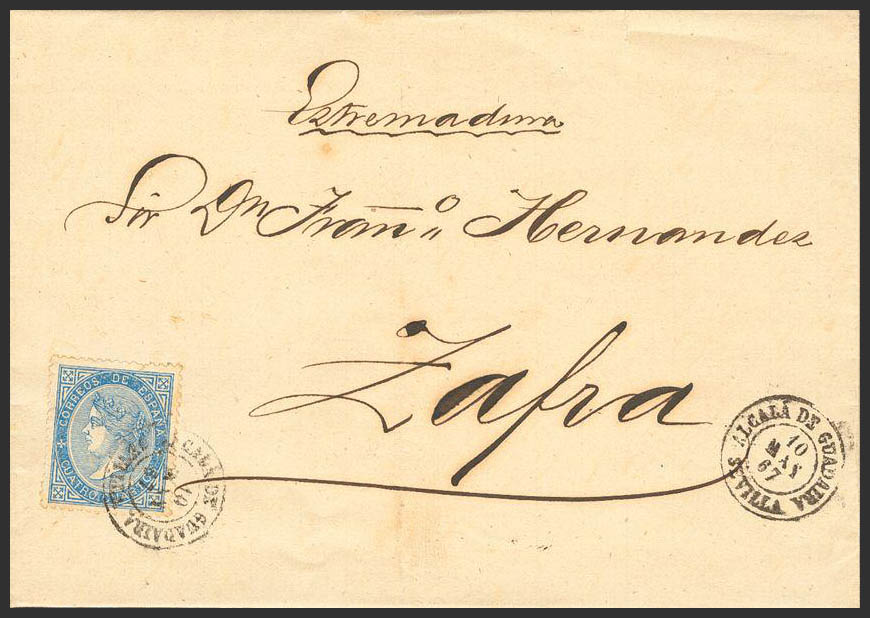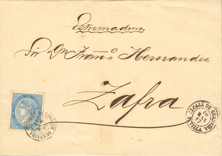 88. 1867. 4 cuartos azul. ALCALA DE GUADAIRA a ZAFRA. Matasello ALCALA DE GUADAIRA / SEVILLA. MAGNIFICA.