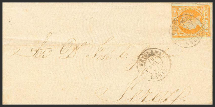 52. 1862. 4 cuartos amarillo. CHICLANA a JEREZ. Matasello CHICLANA / CADIZ. MAGNIFICA Y RARA.