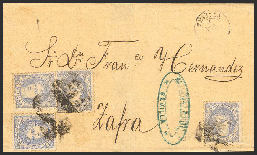 107(4). 1870. 50 mils azul, cuatro sellos. SEVILLA a ZAFRA. Cuádruple porte. MAGNIFICA Y RARA.