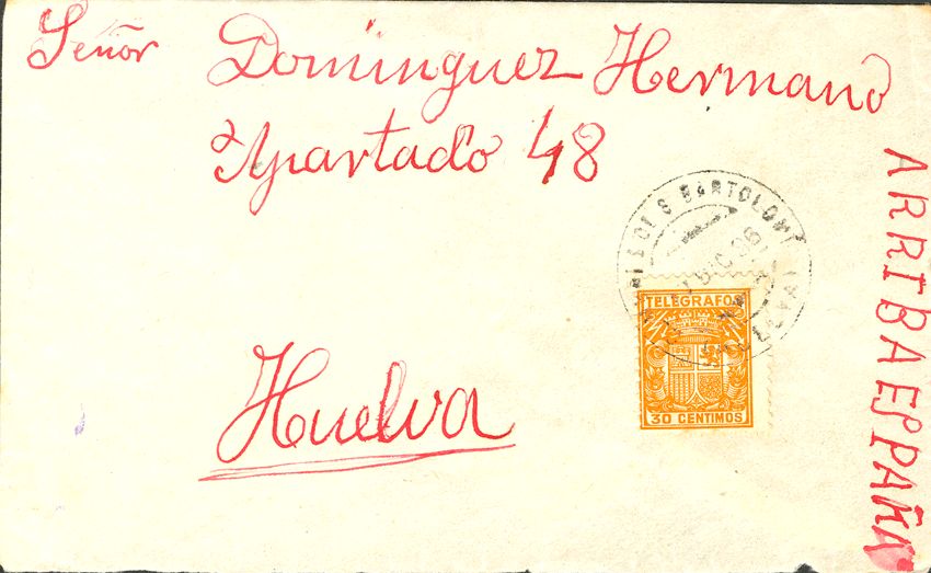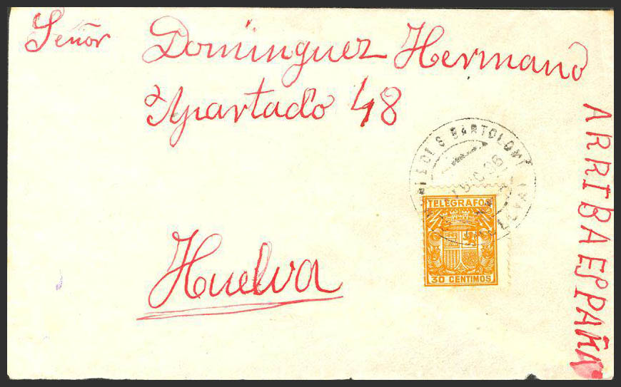 Andalucía. Historia Postal. TELEGRAFOS. Matasello CUMBRES DE S. BARTOLOME / (HUELVA). MAGNIFICA Y RARA.