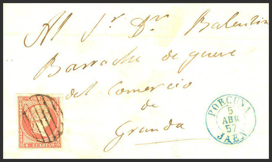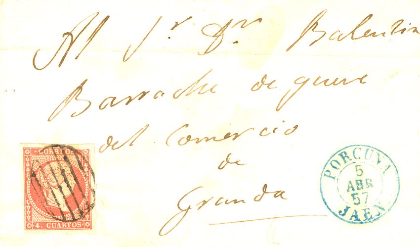 AndalucÃa. Historia Postal. En el frente PORCUNA / JAEN, en azul (Tipo I). MAGNIFICA.
