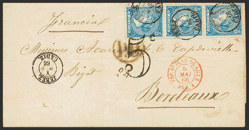 81(3). 1866. 4 cuartos azul, tres sellos. JEREZ a BURDEOS. Matasello JEREZ / CADIZ. MAGNIFICA E INUSUAL COMBINACION A FRANCIA.