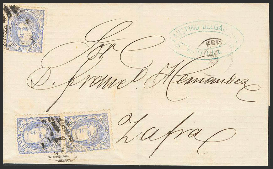 107(3). 1870. 50 mils azul, tres sellos. SEVILLA a ZAFRA. Triple porte. MAGNIFICA.