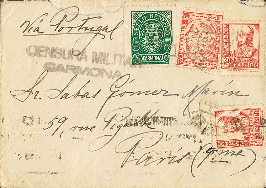 AndalucÃa. Historia Postal. CARMONA / (SEVILLA) y CENSURA MILITAR / CARMONA, al dorso tránsito. MAGNIFICA.